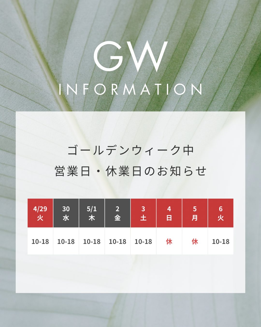 ランベリーのゴールデンウィークの営業日・お休みは下記の通りです。
